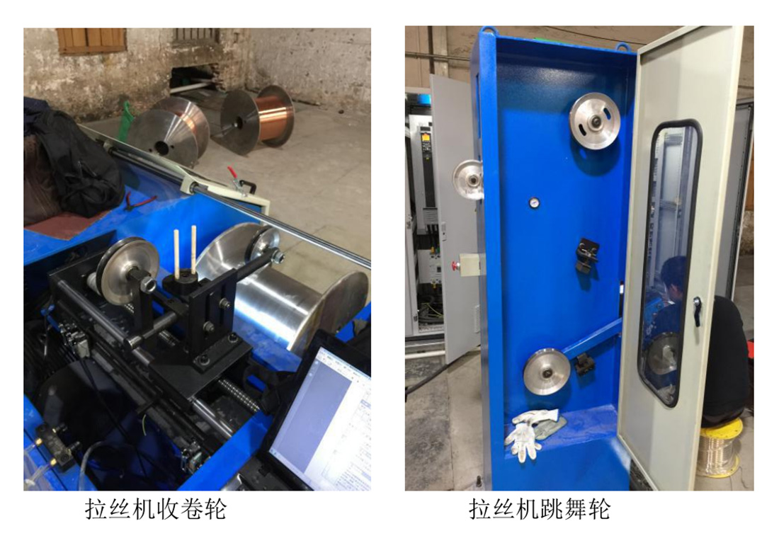 上面兩張圖片是我司技術工程師在廣東佛山某電纜廠拍的,因為當時我們主要是在現場調試后面的收卷部分,也是難點的一部分,所以就拍了收卷輪和跳舞輪的圖片。當時現場的收卷電機是三相異步電動機,功率為15KW,采用18.5KW的FC360頻器進行控制。變頻器外接設備上檢測跳舞輪位置的滑動電阻,作為反饋跳舞輪位置的反饋信號;外接通過PLC 前饋計算后的模擬量輸出作為前饋信號。