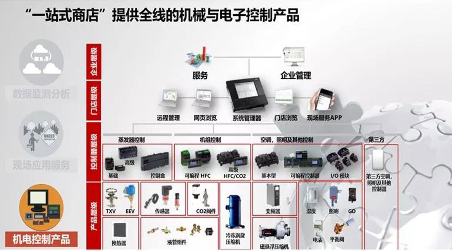 包括Turbocor@磁懸浮無油壓縮機、Danview@樓宇自控系統、MCX可編程控制器、溫濕度傳感器、壓力傳感器、流量傳感器、CO2探測器、溫控器、能量表、動態平衡調節閥、靜態平衡調節閥、電動調節閥、電動蝶閥、手動蝶閥、球閥、板式換熱器、變頻器、冷凍冷藏渦旋壓縮機、電子膨脹閥、熱力膨脹閥、蒸發器控制器、壓縮機組控制器、ADAPKOOL®系統控制器、微通道換熱器以及CO2制冷系統解決方案可涵蓋制冷、空調、照明等方面的各種需求,實現暖通空調和制冷設備的自動監控、優化管理以及能源管理。
