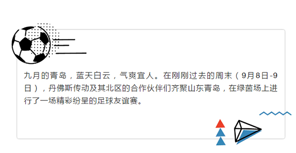 8日上午,在丹佛斯傳動中國區(qū)副總裁盧中平和北區(qū)合作伙伴代表北京聯(lián)澤總經(jīng)理劉劍濤的致辭中,足球賽拉開了帷幕!本次足球賽本著“友誼第一”的原則,為大家提供了一個既可以感受足球魅力,又可以相互交流的平臺。并以此為契機(jī),激發(fā)熱情,強(qiáng)健體魄,凝聚力量!