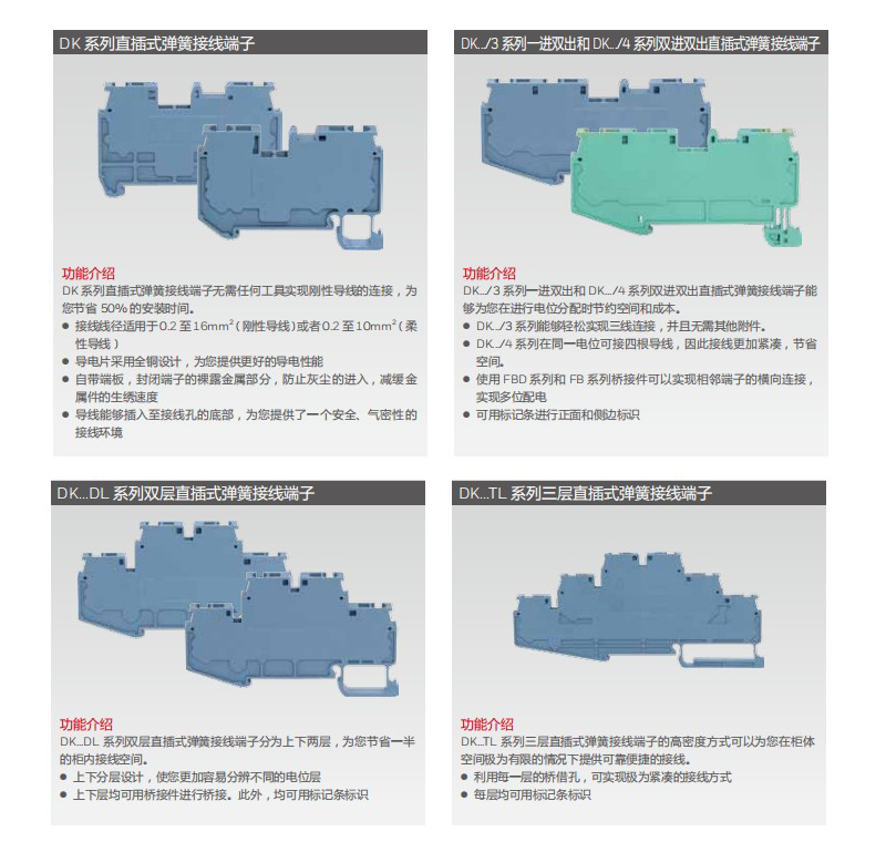 DK系列直插式彈簧接線端子無需任何工具實(shí)現(xiàn)剛性導(dǎo)線的連接,為您節(jié)省50%的安裝時(shí)間。