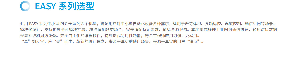 匯川EASY系列全場景緊湊型中小型控制器全系列8個機型,滿足用戶對中小型自動化設備各種需求,適用于嚴苛體積、多軸運控、溫度控制、通信組網等場景。機身模塊化設計,支持擴展卡和模塊擴展,精準適配各類場合,完美適配特定需求,避免資源浪費。本地集成多種工業網絡通信協議,輕松對接數據采集系統和周邊設備。完全自主化的編程軟件,持續迭代易用性功能,符合工程師應用習慣,更易用。 “易”如反掌,應“景”而生,革新的設計理念,來源于真實的使用場景,來源于真實的用戶“痛點”。