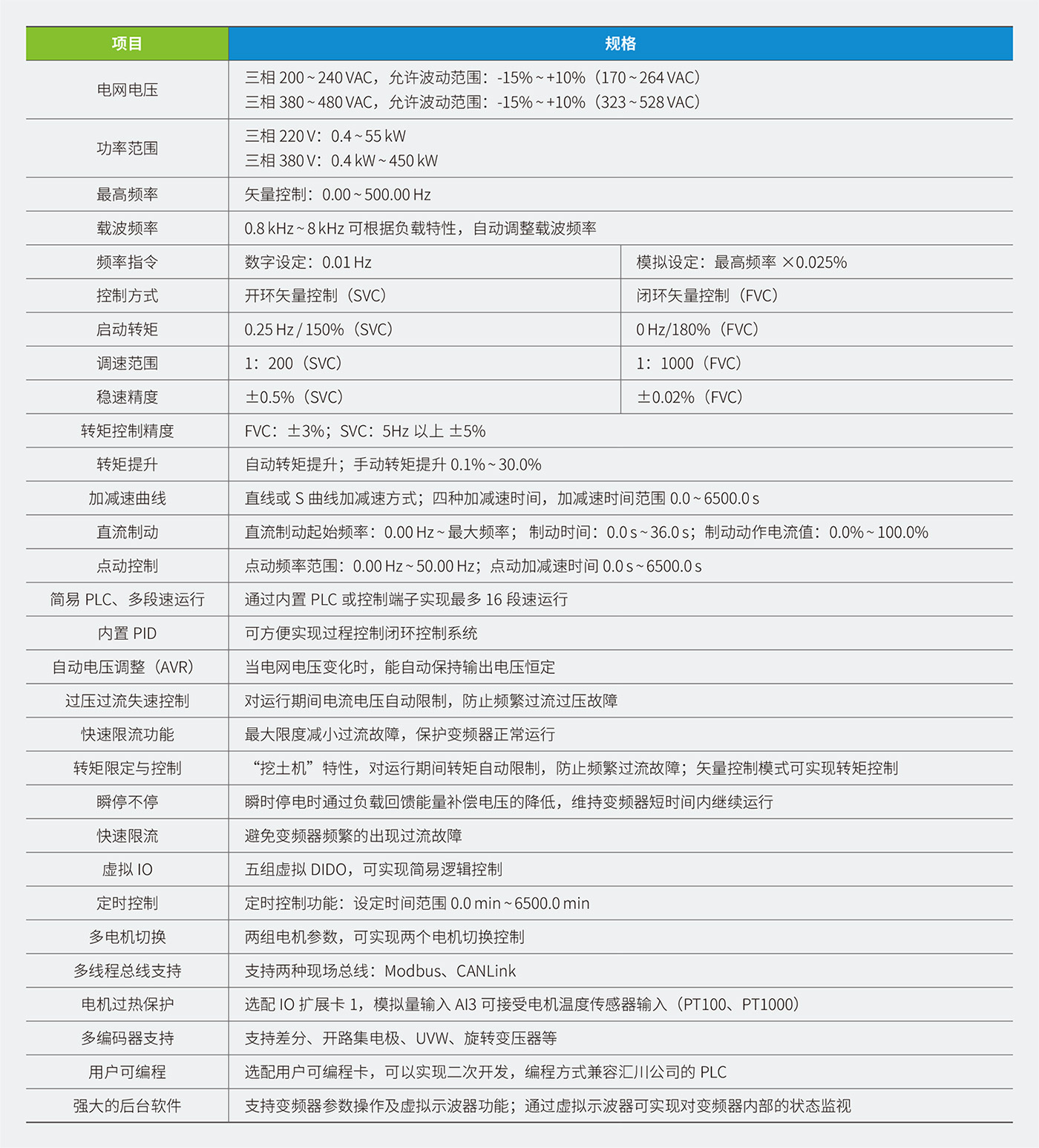 MD500E 系列變頻器是一款通用高性能電流矢量變頻器,主要用于控制和調(diào)節(jié)三相交流同步電機(jī)的速度和轉(zhuǎn)矩,是MD380E 系列的技術(shù)升級(jí)產(chǎn)品。MD500E 采用高性能的矢量控制技術(shù),低速高轉(zhuǎn)矩輸出,具有良好的動(dòng)態(tài)特性、超強(qiáng)的過載能力、增加了用戶可編程功能及后臺(tái)監(jiān)控軟件,通訊總線功能,支持多種PG 卡等,組合功能豐富強(qiáng)大,性能穩(wěn)定。